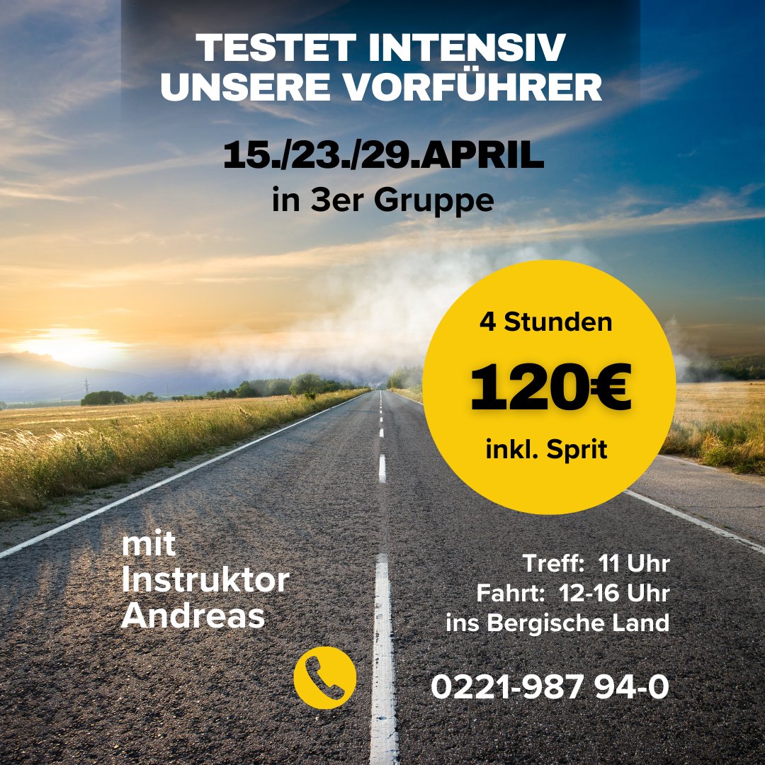 Wer als Kaufinteressent vorab intensiver 2-3 Fahrzeuge einer Kategorie testen möchte kann sich gern zu unseren besonderen 3 Probefahrt- Terminen anmelden. Die Startplätze sind sehr begrenzt. Bitte meldet Euch daher rechtzeitig an: